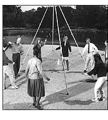 Pyramid, a precision object manipulation device for one or two teams, is a challenging action learning tool that requires cross-functional team performance. It is an excellent assessment tool and an invaluable practice vehicle for improving leadership and team performance. Pyramid requires minimal physical effort yet creates a highly interactive dynamic and can be used in both indoor and outdoor training environments. Pyramid Specifications Frame: Pyramid shaped with 4 adjustable, anodized aluminum tube legs. Dimensions: Max: 10' ht x 12' x 12', Min: 8' ht. x 10' x 10'. Grabber: Line controlled 12" dia. object manipulation device. Object Set: Assorted shapes and sizes. Typical number of participants: 8 to 16. Typical activity area: 16' x 16', indoor or outdoor location. Set-up and Operation Manual Provided. Pyramid Dimensions Shipping Weight/Dim: Frame: 21 Lbs/68" x 7" x 9" Grabber & Object Set: 16 Lbs/16" x 14" x 14" Download a PDF spec sheet for the Pyramid (Acrobat PDF Reader required).